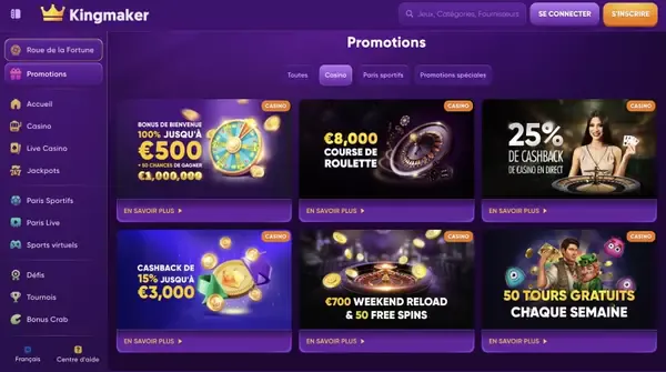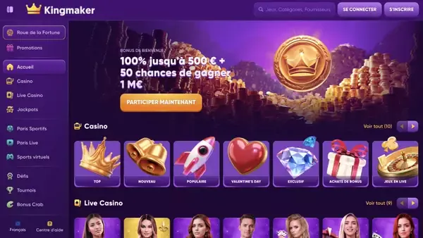 Si vous hésitez à savoir si casino Kingmaker en France est fait pour vous, commencez par l’essentiel : nous prenons en charge le jeu en langue française, nous proposons 7 800 jeux et nous maintenons des dépôts accessibles dès 10 €. Notre site convient aussi bien aux débutants qui veulent des menus guidés et des filtres qu’aux joueurs expérimentés qui comparent les fournisseurs, les notes de RTP et la vitesse des paiements. Vous trouverez également des promotions fréquentes et des tournois de réseau, avec des règles affichées avant votre participation.