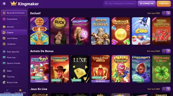 Nous hébergeons 7 800 jeux répartis en cinq grandes catégories : Machines à sous, Casino Live, Jeux de table, Jackpots et Jeux instantanés. Notre bibliothèque est composée de studios reconnus, notamment Pragmatic Play, Play'n GO, NetEnt, Microgaming, Evolution Gaming, Playtech, Novomatic, Popiplay, Playson et Skywind Group. Sur casino Kingmaker, vous pouvez utiliser des filtres pour trier par fournisseur, fonctionnalité ou thème, ce qui aide lorsque vous comparez des titres similaires. Les informations RTP (taux de retour au joueur) s’inscrivent dans notre approche d’équité et sont auditées par des organismes indépendants comme iTech Labs et GLI.