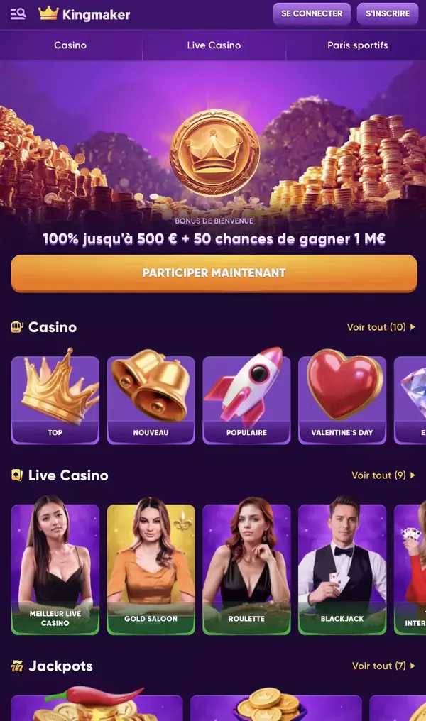 Pour retrouver vos favoris, utilisez les tuiles de catégories, la barre de recherche ou les filtres par fournisseur. Cela facilite la navigation dans le lobby casino Kingmaker, que vous cherchiez des tables avec croupier en direct, des jackpots ou des jeux instantanés pour des parties rapides. Pour les machines à sous, notre sélection machines à sous casino Kingmaker inclut des titres de Pragmatic Play, NetEnt, Microgaming et Play'n GO, ainsi que de nombreux autres fournisseurs présents dans notre catalogue.